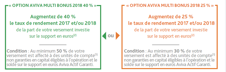 Cette opération Aviva Multi Bonus 2018 propose d’augmenter le rendement du support en euros de 25 % ou de 40 % en 2017 et/ou en 2018 si des conditions de montant et de pourcentage minimum d’unités de compte comportant un risque de perte en capital sont respectées.